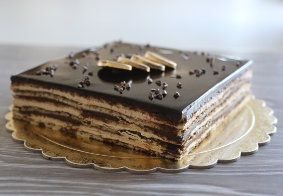 A classic cake layered with chocolate, hazelnut buttercream and chocolate glazing