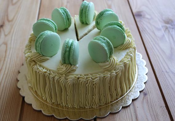 A Classic cake made with a delicious layering of pistachio buttercream and sponge and topped with pistachio macaroons