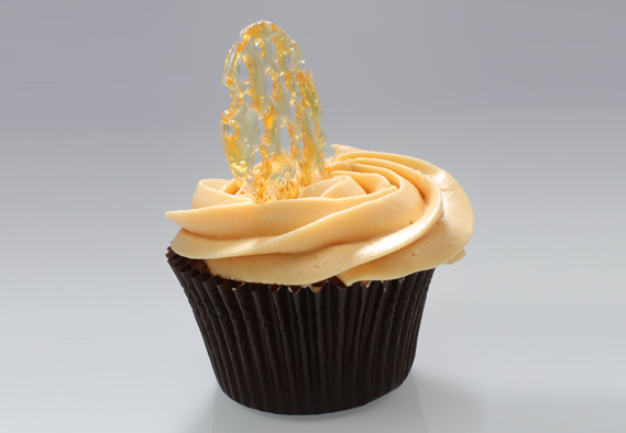 Caramel sponge with caramel sauce filling, with caramel buttercream. Garnish with pull sugar